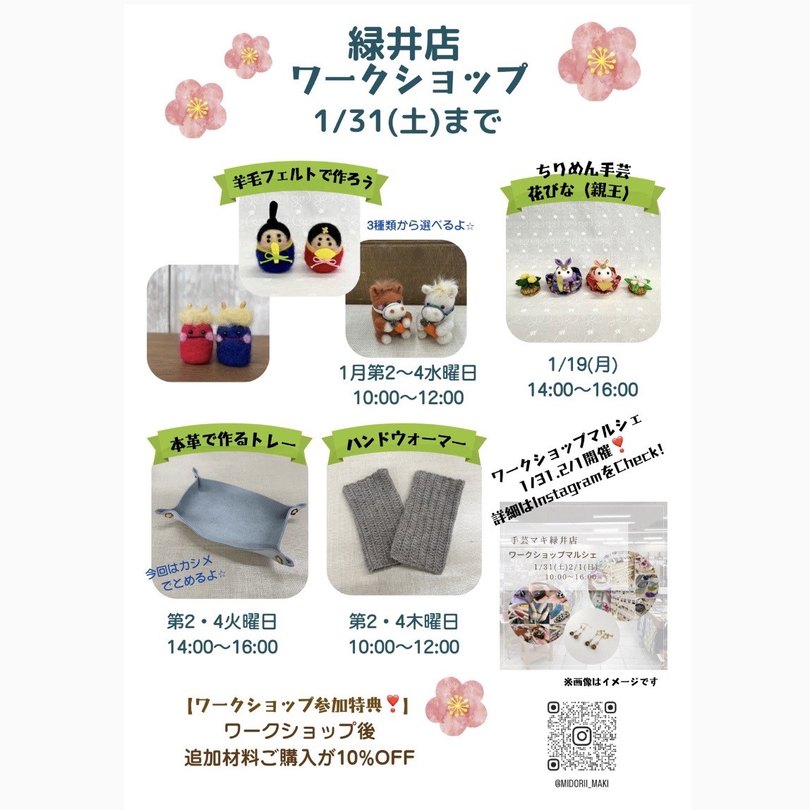 緑井店では今月もスタッフによるワークショップを開催しています。編み物・羊毛フェルト・ちりめん手芸・カシメ打ち等々いろいろな手作りが体験できます。記載以外での日程相談も可能ですので、お気軽にお問合せ下さい。 緑井店の各教室 […]