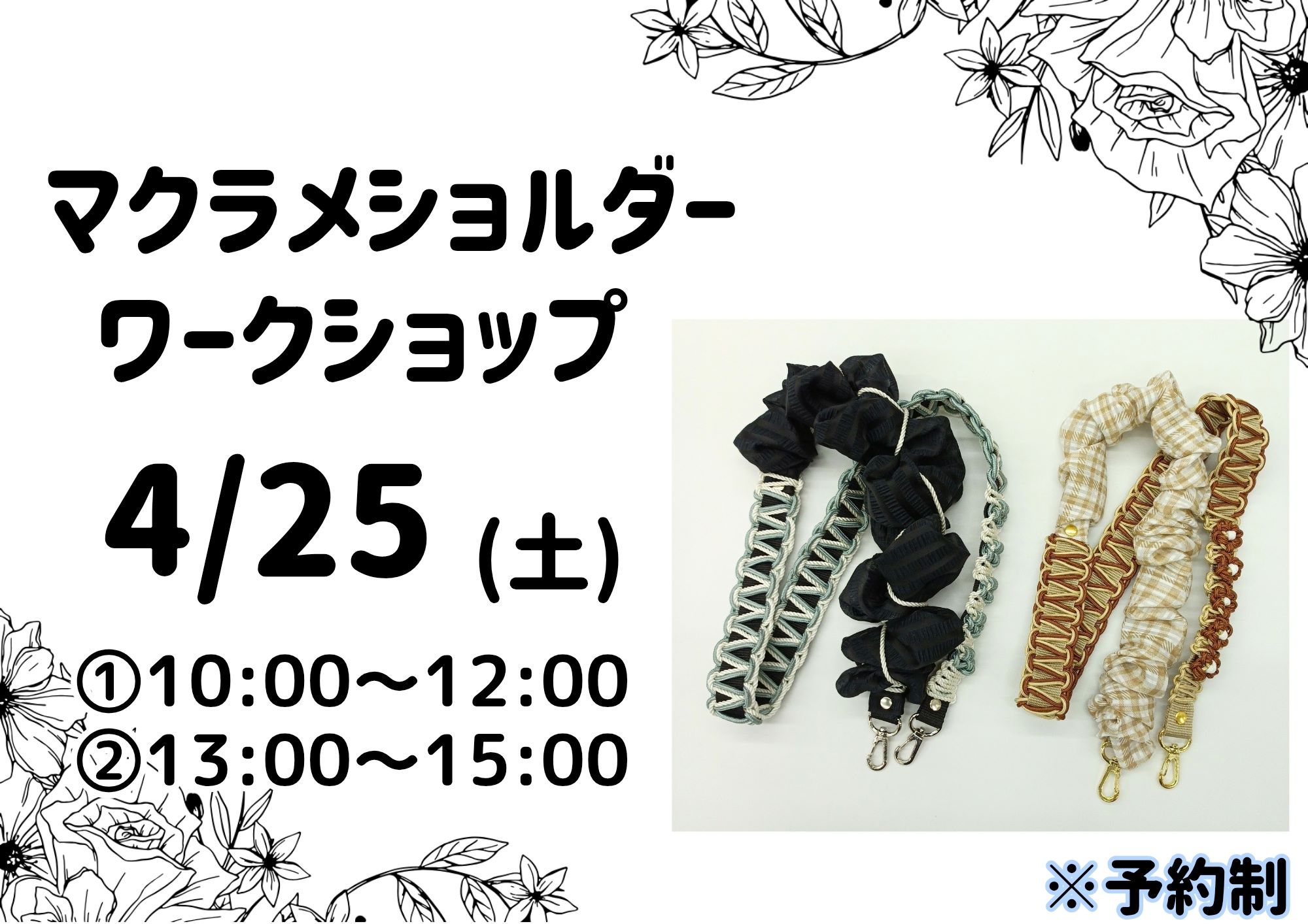 いつも手芸マキをご利用いただきありがとうございます。 広島店では、4月18日(土)と25日(土)にワークショップを開催します! 今回は、既成のショルダーに2色のひもを選んで平結びをしていただきます。2色使うだけで、1色を […]