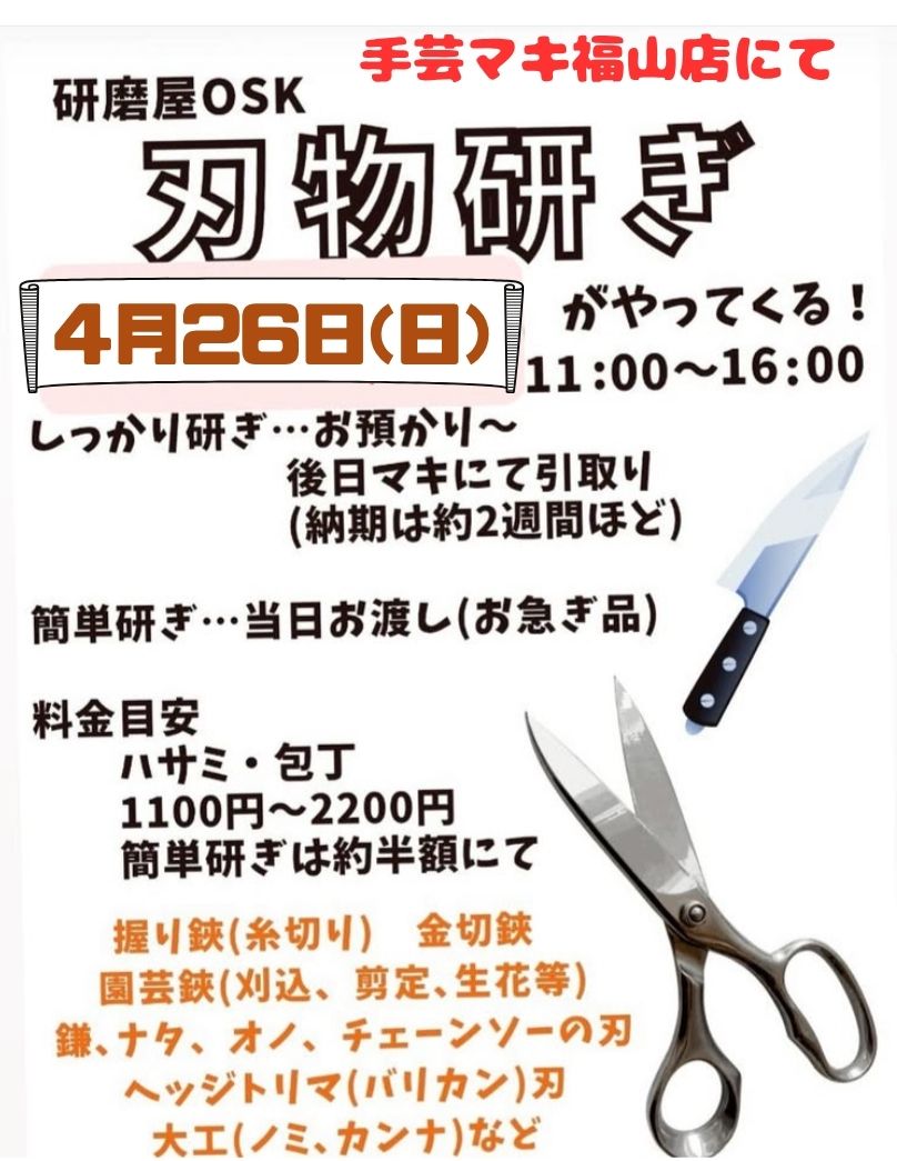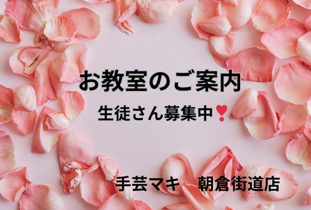 こんにちは、手芸マキ朝倉街道店です。いつもご利用有難うございます。 『和物教室 紫陽花』日時:4月17日(金) 10:30~12:30 /13:00~15:00 定員:1名講習料:1,500円/1回(※材料費別途)ちりめ […]