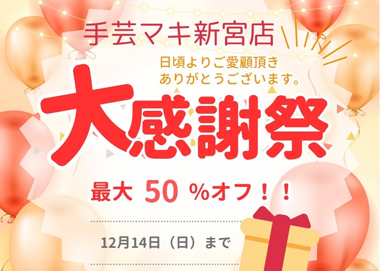手芸マキ新宮店では今年の12月に23周年を迎えるにあたり皆様への日頃の感謝をこめて、「大感謝祭」を開催しております。 12/14(日)までの期間中は最大50%割引になっております。プリント生地、服地、ビーズ、ボタン、紐、 […]