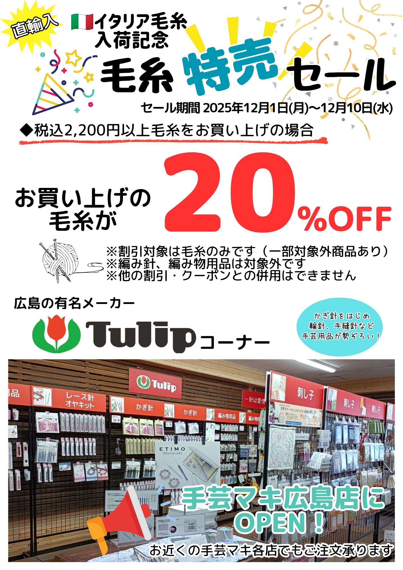 いつも手芸マキをご利用いただきありがとうございます。 今年もイタリア直輸入の毛糸が入荷しました! 入荷を記念して、12月1日(月)から10日間限定!毛糸20%OFFセールを開催します。 毛糸(編み針、編み物用品を除く)を […]