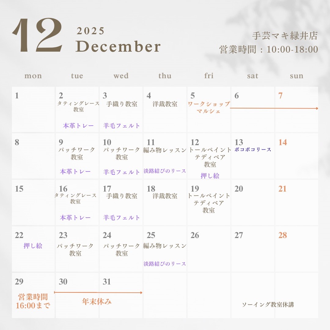 カリーノ菊陽店の今月の予定はこちら! 各教室生徒さん募集中です♪ 編み物教室は12月はほぼ満員となっております。 1月もご予約埋まってきておりますので、お早めのご予約をお願いいたします! 布ぞうりのワークショップは随時ご […]