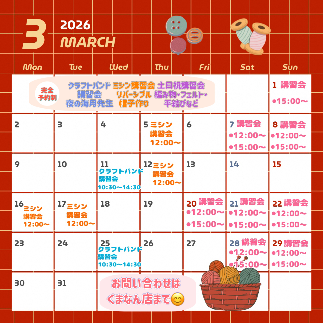 こんにちは岡山平井店です。逃げていく2月が半ばとなりました!慌ただしい毎日の中、ちょっとひと息、手芸屋さんで手作り体験してみませんかどのワークショップもご予約承ります!講習料などのお問合せ、ご予約は手芸マキ岡山平井店へお […]
