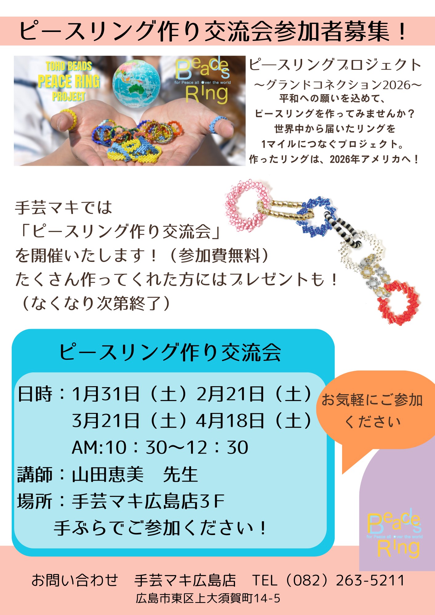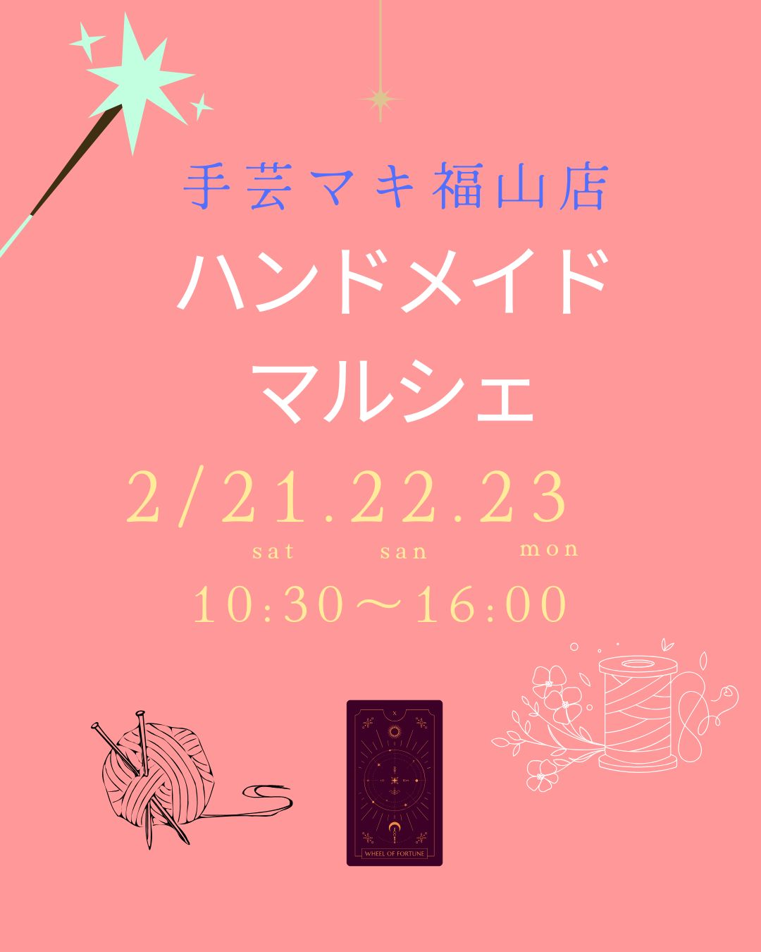 いつも手芸マキ福山店をご利用いただきありがとうございます。1.2.3月 週末&祝日限定ワークショップの作家さまを募集しています。☆ 1日2名限定☆ブース代 550円☆時間 10:30〜16:00手づくりの温かさを、みなさ […]