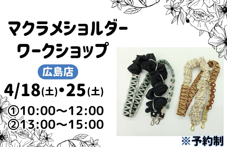 いつも手芸マキをご利用いただきありがとうございます。 広島店では、4月18日(土)と25日(土)にワークショップを開催します! 今回は、既成のショルダーに2色のひもを選んで平結びをしていただきます。2色使うだけで、1色を […]