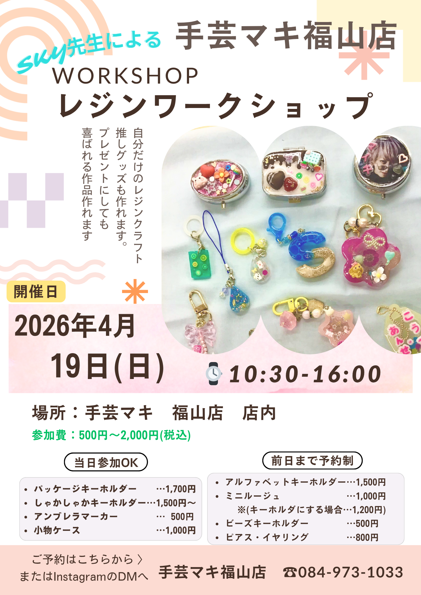 福山店で開催中のレジン体験のご案内です。 日時: 4月19日(日) 10:30~16:00人気のアンブレラマーカーや、しゃかしゃかキーホルダー他にも推しグッズ等作れます!時間もたっぷりありますので、ゆっくりと製作できます […]