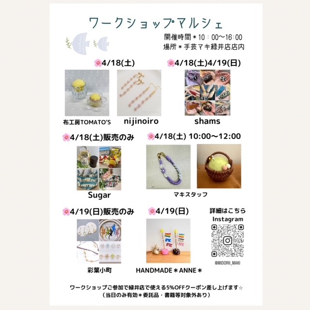 緑井店の4月の教室・ワークショップのご案内です。各教室は随時生徒さん募集中!今月は4/18.19に作家さん参加のワークショップマルシェも開催いたします☆ また、1dayワークショップを開催していただく作家さんや各マルシ […]