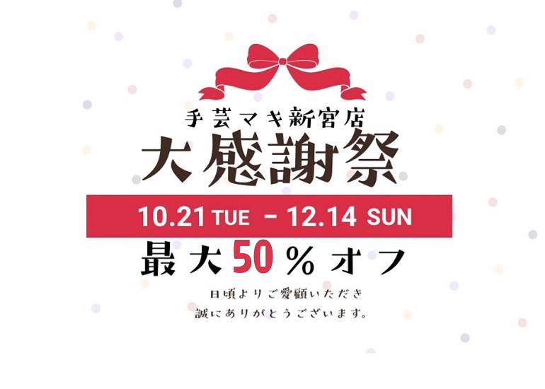 12/14(日)までの期間中は最大50%から割引になっております。多数の商品がお求め安くなっておりますので、この機会に是非手芸マキ新宮店にお越しくださいませ。